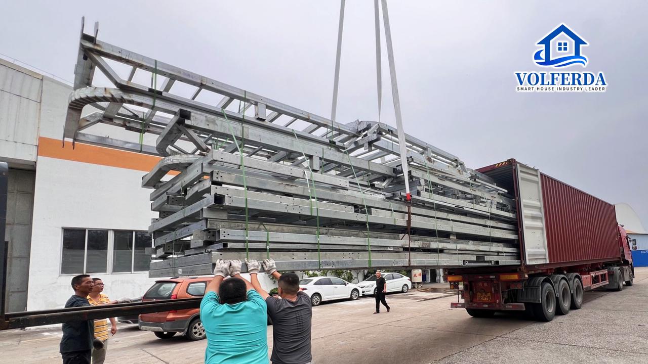 The house is fully completed at the factory before being shipped. This is usually done using 40-foot high cube containers (40HQ) or flat rack containers.