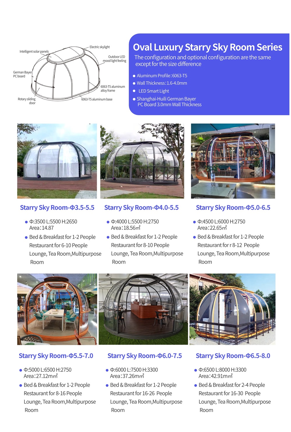 Model φ3.0-4.5:φ: 3500mm, L:4500m, H:2450mm, Aera:12m², People: 1-2 person, Applicable Scenarios Café, Western Restaurant Model φ3.5-5.5:φ: 3500mm, L:5500m, H:2650mm, Aera:14.87m², Bed & Breakfast for 1-2 People, Restaurant for 6-10 People Lounge, Tea Room,Multipurpose Room Model φ4.0-5.5:φ: 4000mm, L:5500m, H:5500mm, Aera:18.56m², Bed & Breakfast for 1-2 People, Restaurant for 8-10 People Lounge, Tea Room,Multipurpose Room Model φ4.5-6.0:φ: 4500mm, L:6000m, H:2750mm, Aera:22.65m², Bed & Breakfast for 1-2 People, Restaurant for 8-10 People Lounge, Tea Room,Multipurpose Room Model φ5.0-6.5:φ: 5000mm, L:6500m, H:2750mm, Aera:22.65m², Bed & Breakfast for 1-2 People, Restaurant for 8-12 People Lounge, Tea Room,Multipurpose Room Model φ5.5-7.0:φ: 5500mm, L:7000m, H:2750mm, Aera:27.12m², Bed & Breakfast for 1-2 People, Restaurant for 8-16 People Lounge, Tea Room,Multipurpose Room Model φ6.0-7.5:φ: 6000mm, L:7500m, H:3300mm, Aera:37.26m², Bed & Breakfast for 1-2 People, Restaurant for 16-26 People Lounge, Tea Room,Multipurpose Room Model φ6.5-8.0:φ: 6500mm, L:8000m, H:3300mm, Aera:33.16m², Bed & Breakfast for 2-4 People, Restaurant for 16-30 People Lounge, Tea Room,Multipurpose Room |